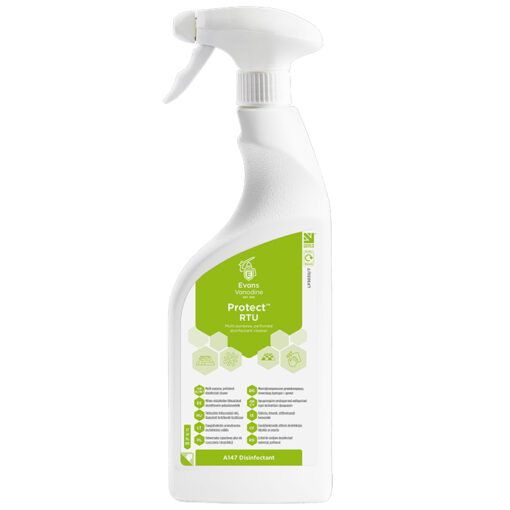 Evans PROTECT RTU 是一款即用型、多用途、帶香味的清潔劑及消毒劑。它能殺滅細菌,並在建議的稀釋比例和接觸時間下通過 EN 1276 標準測試。它亦通過 EN 16777 和 EN 14476 標準測試;有效對抗包膜病毒,包括冠狀病毒。適用於學校、休閒中心、診所以及任何存在交叉感染風險的地方。適用於地板、牆壁和各種硬質表面。不適用於食物接觸表面。使用前請務必閱讀標籤和產品說明。