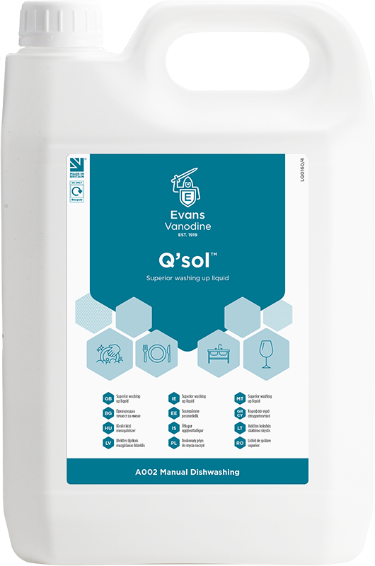 Evans Q’SOL Washing Up Liquid is a concentrated formula for the manual cleaning of crockery, glassware, and kitchen utensils. It produces a rich, high foam, even under heavily soiled conditions.